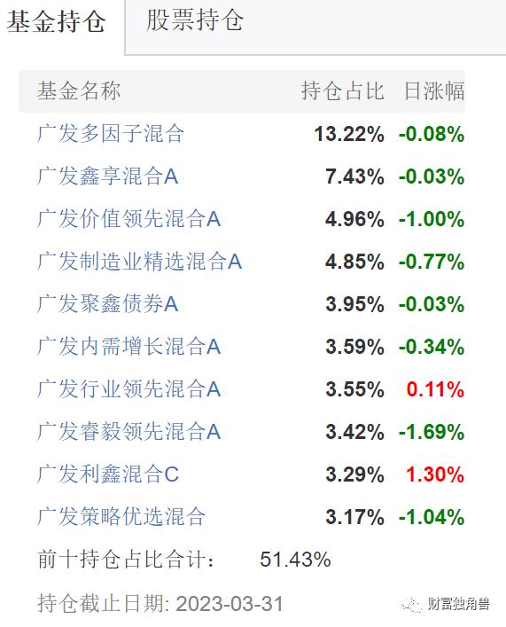 笔者在贴吧中发现,有基民称,广发核心优选六个月持有混合(FOF)A买的全是自家基金,肥水不流外人田!顺着这个线索,笔者发现该基金的确有这个现象,据该基金2023年一季报显示,前十大重仓股持仓占比达51.43%,几乎全部都是来自广发基金的产品,这就如同连环套一样,难道这些基金的部分机构持仓就是来自于自家的FOF基金?通过如此循环持股,从而让基民认为,该基金有很多机构持有份额,以此来吸引基民踊跃购买?