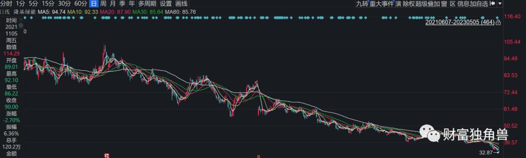 然而,或许是经受不住隆基股份股价大跌,到了2022年一季度,又减持至1641.63万股。值得关注的是,2022年一季报该基金前三大重仓股中,隆基股份、晶澳科技、阳光电源股价,这些股票价格均出现大幅下跌。以隆基绿能为例,自2021年11月2日至2023年5月5日,隆基股份区间跌幅66.91%。然而,刘格菘却于2022年二季度后又相继加仓了隆基股份,截至2023年一季度,该基金持有隆基股份2508.25万股。