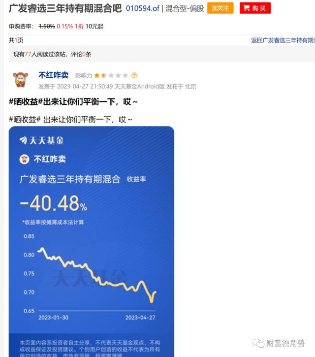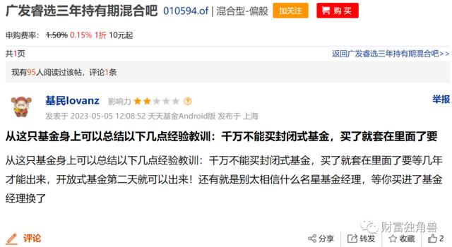 有基民发帖表示,从这只基金身上可以总结以下几点经验教训:千万不能买封闭式基金,买了就套在里面了要等几年才能出来,开放式基金第二天就可以出来!还有就是别太相信什么名星基金经理,等你买进了基金经理换了。也有基民跟帖表示,太坑人了,亏损40%多了,三年了,快到头了,可能要亏50%吧。