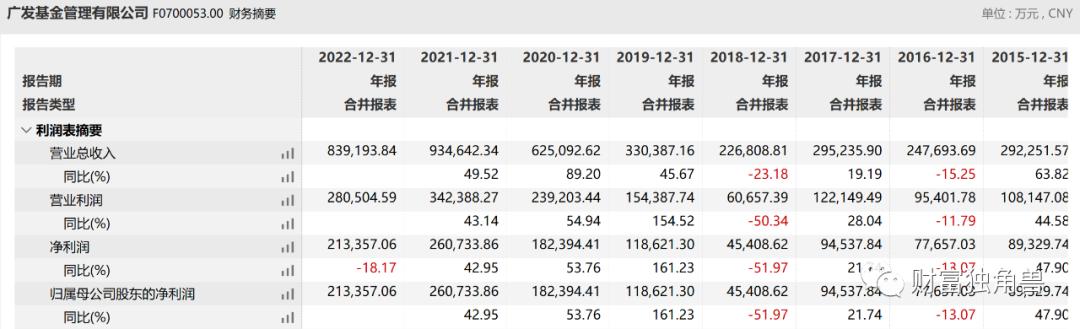 据Wind风控显示,广发基金管理有限公司2023年4月23日披露2022年年度重要财务指标,2022年净利润21.34亿元,同比下降17.53%;营业收入83.92亿元;总资产为163.93亿元,上年同期总资产为149.44亿元。尽管净利润出现下降,但管理费可没少收,广发基金管理基金564只,管理基金资产1.23万亿元,管理费用总计73.57亿元。