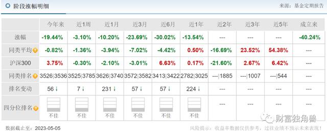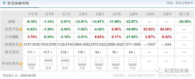 从收益率上,该基金自成立来至今收益率-40.24%,这意味着如果基民持有该基金到现在,一万元要亏4000多。即使把时间周期缩短,今年来收益率-19.44%,同类排名3526|3536;近3月来收益率-23.69%,同类排名3572|3582;近6月来收益率-30.02%,同类排名3413|3422;近1年来收益率-13.54%,同类排名2782|3025,从所有周期看,该基金的基金状态全部为不佳。