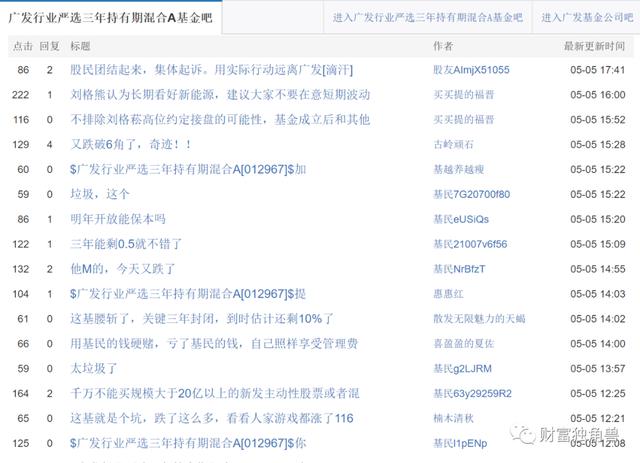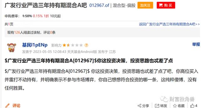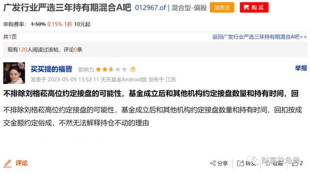 也有基民表示,广发行业严选三年持有期混合A[012967]提前放开吧,不要折磨基民啦,用基民的钱硬赌,亏了基民的钱,自己照样享受管理费。甚至有基民称,千万不能买规模大于20亿以上的新发主动性股票或者混合型基金,规模大基金经理一次赚够了,资金全是用来做接盘侠,掩护其本人及利益相关方出逃。