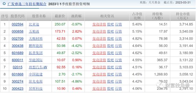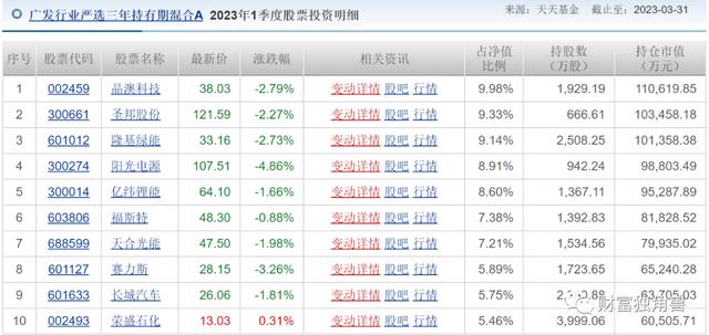 值得关注的是,记者发现,2021年三季度,广发行业严选三年持有期混合A已经持有1,266.62万股的晶澳科技,然而,自2021年11月22日创出103元/股高点后,晶澳科技股价一路下跌,2022年6月晶澳科技股价曾涨至84元/股,然而,股价并未强势,此后股价持续下跌。自2021年11月19日至2023年5月5日晶澳科技区间跌幅59.72%。截至2023年一季度,该基金还是持有1929.19万股,占比10.07%,位列第一大重仓股。