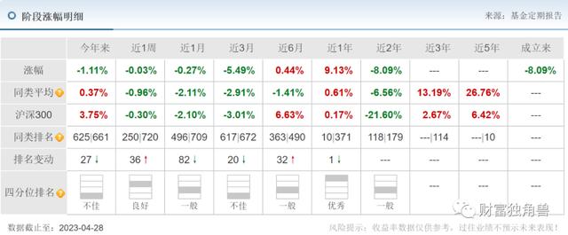 笔者发现,该基金成立初期,基金经理为苗宇,自2020年12月22日至2022年11月3日,在苗宇所管理的1年又316天里,该基金的收益率是-21.63%。2022年11月4日至今,这期间又把苗宇更换为观富钦。