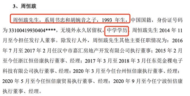 值得一提的是,周书忠和胡婉音之子——周恒跋出生于1993年,仅为中学学历,目前担任恒勃控股董事一职,还是浙江恒倍康、东莞金稞电子科技有限公司、台州恒倍康、恒倍康贸易宁波恒倍康的执行董事、经理。