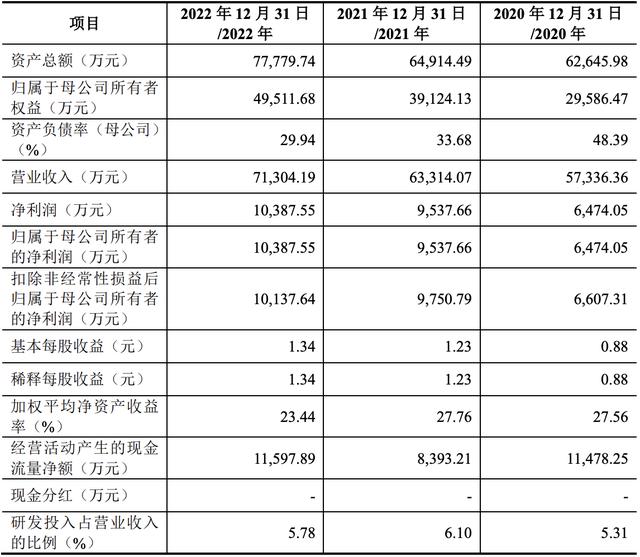 2020年、2021年和2022年,恒勃股份的营收分别约为5.73亿元、6.33亿元和7.13亿元,净利润分别约为6474.05万元、9537.66万元和1.04亿元,扣非后净利润分别约为6607.31万元、9750.79万元和1.01亿元。