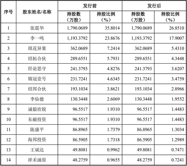 同时,李一鸣持股23.8676%,经论思守、锦冠壹号分别持股4.8276%、4.6345%,李仙德持股2.6069%,诚毅欣锐、东磁投资分别持股1.9310%。其中,经论思守为李一鸣持有的一人有限公司;绍邦合伙为有限合伙企业,李一鸣担任执行事务合伙人。