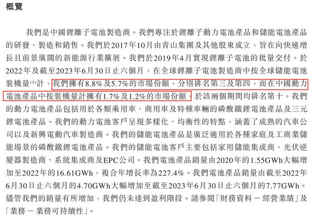 根据弗若斯特沙利文报告显示,在2022年和2023年上半年,按照装机量统计,瑞浦兰钧在全球储能电池厂商排名分别为第三和第四,业务市场占比分别为8.8%和5.7%。而根据中国动力电池产业创新联盟的统计,2023年1-10月,瑞浦兰钧动力电池在中国的装机量排名为第11名,占比为1.07%。