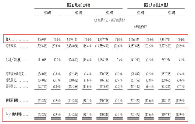 然而青山集团如此供养却并没能让瑞浦兰钧实现盈利。2020-2023年上半年(简称“报告期”),瑞浦兰钧的营业收入分别为9.07亿元、21.09亿元、146.48亿元及65.95亿元,报告期的完整财年,营收年复合增长率高达301.90%,然而瑞浦兰钧却一直未能实现盈利。同期,公司净利润分别为-0.53亿元、-8.04亿元、-4.51亿元和-9.20亿元,3年半时间合计亏损达到22.28亿元。