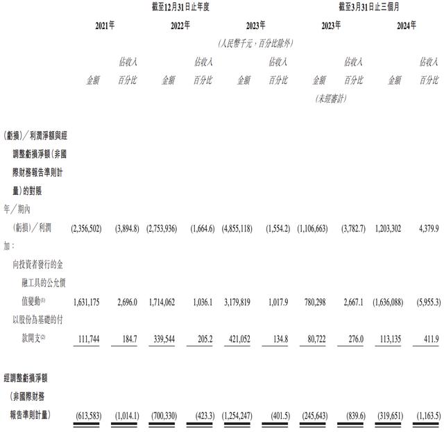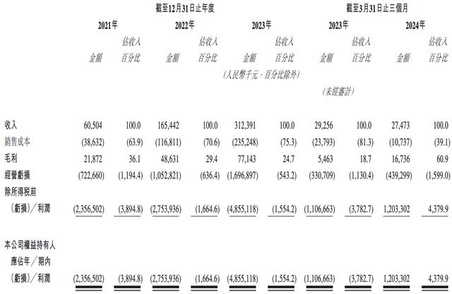 2021年、2022年和2023年,黑芝麻智能的收入分别为6050.4万元、1.65亿元和3.12亿元,毛利分别为2187.2万元、4863.1万元和7714.3万元,净亏损分别为23.57亿元、27.54亿元和48.55亿元,经调整净亏损分别为6.14亿元、7.00亿元和12.54亿元。