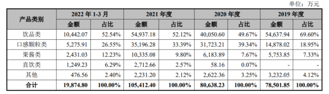 值得关注的是,来自口感颗粒类的收入占比在2020年达到顶峰后逐渐走低。2020年度,来自口感颗粒类收入为3.17亿元,占比总营收的39.34%;2021年度,来自该品类收入为3.52亿元,占比总营收33.39%;2022年一季度来自该品类收入为5275.91万元,占比总营收的26.55%。