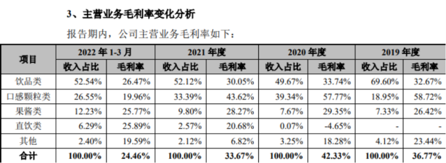 另一个值得投资者密切关注的是,鲜活饮品的毛利率报告期内大幅波动。2019-2021年度及2022年一季度,公司毛利率分别为36.84%、42.31%、33.64%和24.50%。