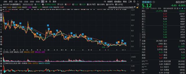 截止2023年11月22日,贵阳银行报收于5.12元/股,PE为3.0倍,PB为0.34倍,市值为187亿元。
