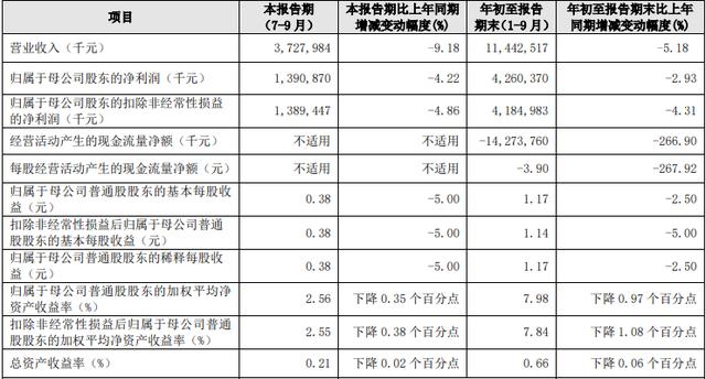 而2023年前三季度,贵阳银行实现营业收入114.43亿元,同比下滑5.18%;实现归母净利润42.6亿元,同比下滑2.93%。净息差为2.14%,同比减少0.22个百分点。加权净资产收益率为7.98%。
