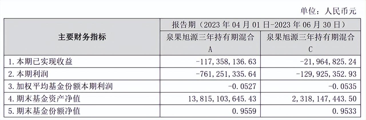 根据基金二季报,泉果旭源三年持有A份额利润亏损7.61亿元,泉果旭源三年持有C份额利润亏损约1.30亿元,基金合计利润亏损8.91亿元。