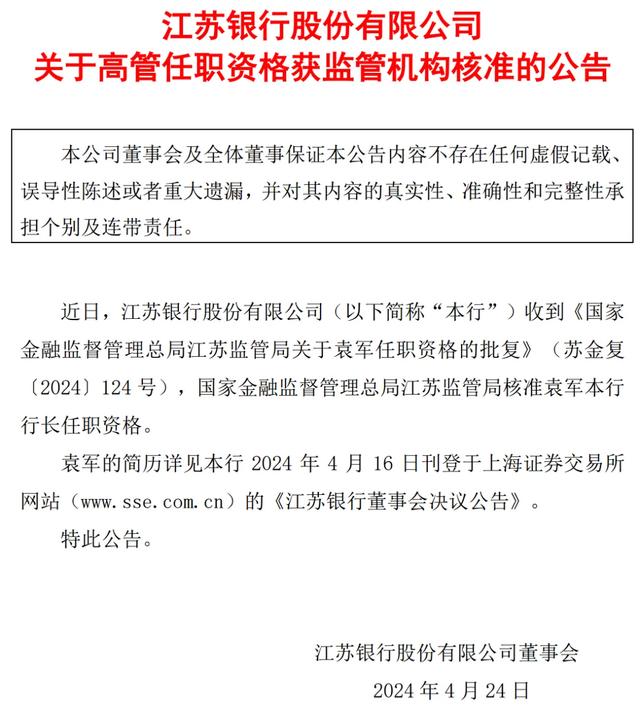 4月23日,江苏银行(600919.SH)公告称,近日收到批复,国家金融监督管理总局江苏监管局核准袁军江苏银行行长任职资格。