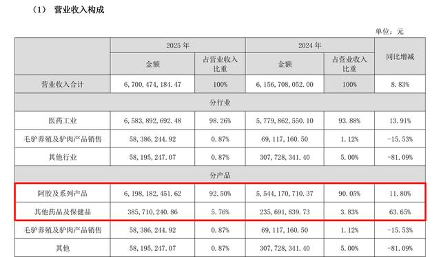 67亿营收的版图里,在主业稳健增长的情况下,新业务占比首次突破5%。这个数字看似不大,但对于一家过去25年几乎只靠阿胶打天下的公司而言,它意味着一个全新的增长极正在从边缘走向前台。