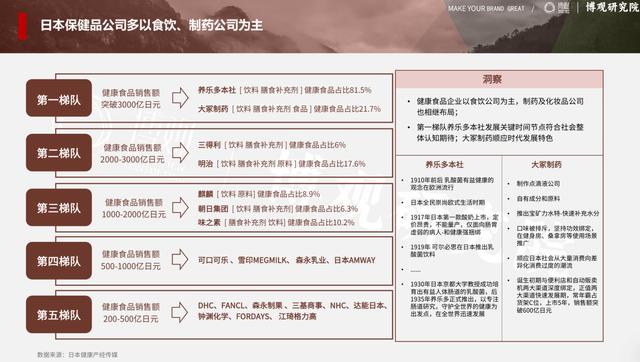 日本的产业史有所印证。1970年到2000年的功能性食品革命,孕育了养乐多和汉方颗粒剂等国民级品牌。这一点,从以下博观研究院对日本保健品公司发展情况的整理中也能看到。