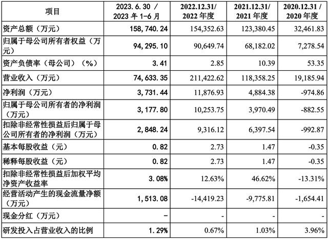 2020年、2021年、2022年和2023年上半年,昆仑新材的营收分别为1.92亿元、11.84亿元、21.14亿元和7.46亿元,净利润分别为-974.86万元、4884.38万元、1.19亿元和3731.44万元,扣非后净利润分别为-992.87万元、6397.54万元和9316.12万元和2848.24万元。
