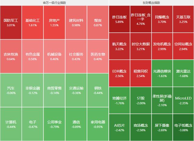 分行业来看,国防军工、基础化工、房地产、建筑材料等行业领涨,家用电器、通信、公共事业、电子、计算机等行业领跌。