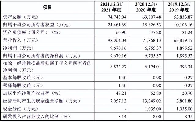 根据招股说明书显示,2019-2021年,公司营业收入分别为6.38亿元、7.19亿元和9.81亿元,年复合增长率24%;同期净利润分别为1895.52万元、6755.37万元和9670.16万元,年复合增长率126%。