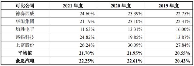 除此之外,毛利率也是一个非常重要的财务数据。过去三年,公司主营业务毛利率分别为20.43%、22.61%和22.25%,整体保持稳定。而且,即便与同行公司相比,豪恩汽电也依旧高于行业平均水平。