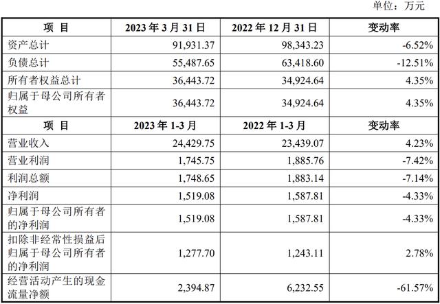 另据招股书披露,豪恩汽电2023年第一季度的营收为2.44亿元,较2022年同期的2.34亿元增长4.23%;净利润1519.08万元,较2022年同期的1587.81万元下降4.33%;扣非后净利润为1277.7万元,较2022年同期的1243.11万元增长2.78%。