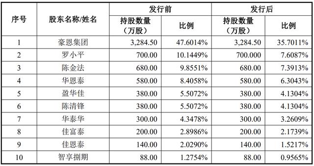 其中,豪恩集团持股47.60%,罗小平持股10.14%,华恩泰持股8.41%,盈华佳持股5.51%,华泰华持股4.35%,佳富泰持股2.90%,佳恩泰持股2.03%,智享捌期持股1.28%,资正管理持股0.96%,佳平泰持股0.87%,宁波慧和持股0.60%。