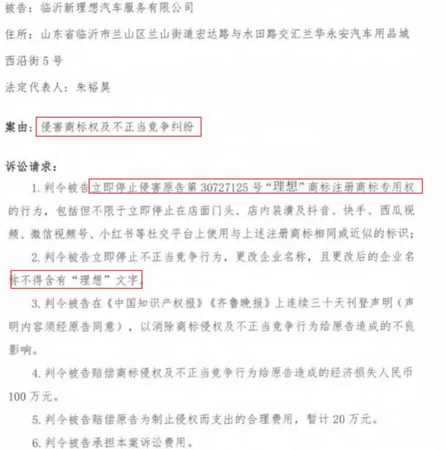 最近,理想汽车以“侵害商标权及不正当竞争纠纷”为由,起诉了山东临沂从事汽车贴膜业务的“临沂新理想汽车服务有限公司”。