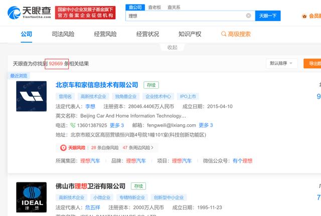 全国叫“李想”人都不下万人,企业中带有“理想”二字的就更多了。据天眼查显示,全国范围内,名称中带有“理想”二字公司共有92666家,其中经营范围与汽车相关的也不在少数。