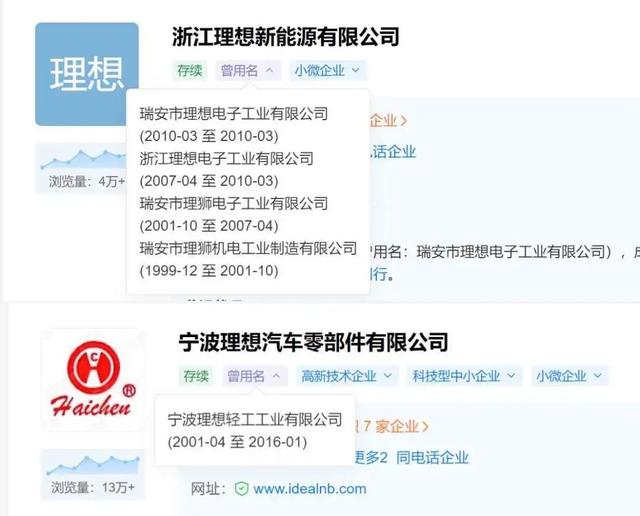 如浙江理想新能源有限公司、宁波理想汽车零部件有限公司等,他们和上述汽车贴膜店一样,早在理想汽车成立之前,公司名称就已经有“理想”二字了。