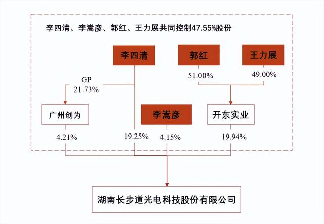 据招股书介绍,李四清直接持有长步道19.25%股份,通过广州创为间接控制该公司4.21%股份;李嵩彦直接持有该公司4.15%股份;郭红、王力展通过开东实业间接控制该公司19.94%股份。据此,四人合计控制该公司47.55%的表决权。