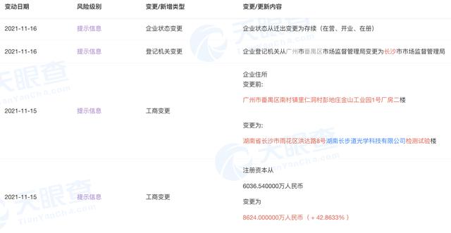 天眼查信息显示,长步道成立于成立于2010年3月,前身为位于广东省广州市的广州长步道光电科技有限公司,后于2021年11月迁移至湖南省长沙市,并更名为湖南长步道光电科技股份有限公司。