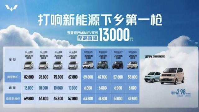 为了抵抗其他玩家的竞争,五菱无奈祭出“以价换量”的策略。2023年2月和5月,宏光MINI EV家族先后限时优惠3000元、直降1.3万元,最低到手价仅2.98万元。