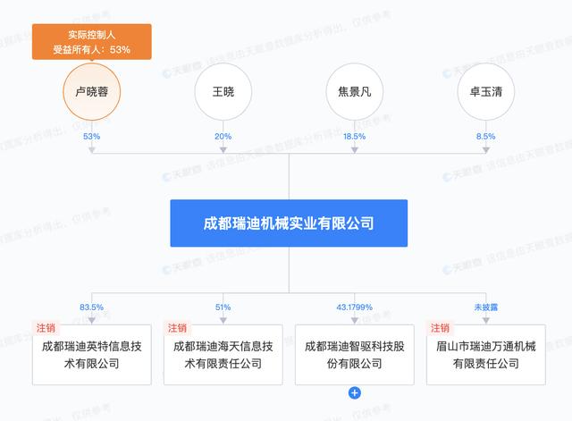 天眼查App显示,瑞迪智驱成立于2009年2月,前身成都瑞迪阿派克斯国际贸易有限公司,位于位于四川省成都市。目前,该公司的注册资本为4133.8554万元,法定代表人为卢晓蓉,股东包括瑞迪实业、卢晓蓉、王晓等。