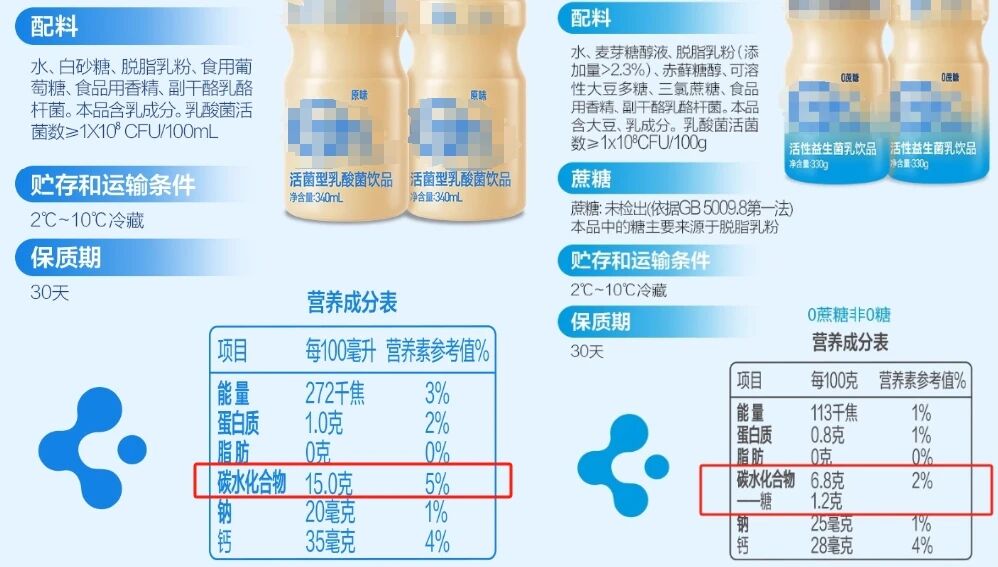 记者对比市售多款乳酸菌饮品成分表发现,部分乳酸菌饮料的含糖量较高,例如某些产品每100ml的碳水化合物含量可达15克以上;对比之下,同系列减糖版的乳酸菌饮料,每100ml的碳水化合物含量为6.8克。