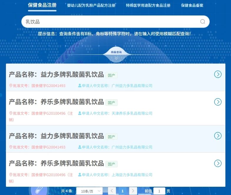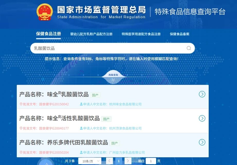为进一步了解乳酸菌饮料的保健食品注册情况,《消费者报道》记者查询国家市场监督管理总局官网发现,乳酸菌饮品共有3项保健食品注册信息,分别为味全R乳酸菌饮品(批准文号:国食健字G20150042)、味全R活性乳酸菌饮品(批准文号:国食健字G20040177)、养乐多牌代田乳酸菌饮品(批准文号:国食健字G20050204)。其中,味全R乳酸菌饮品的有效期为2020年1月18日,即该款产品的“健字号”注册信息已失效。