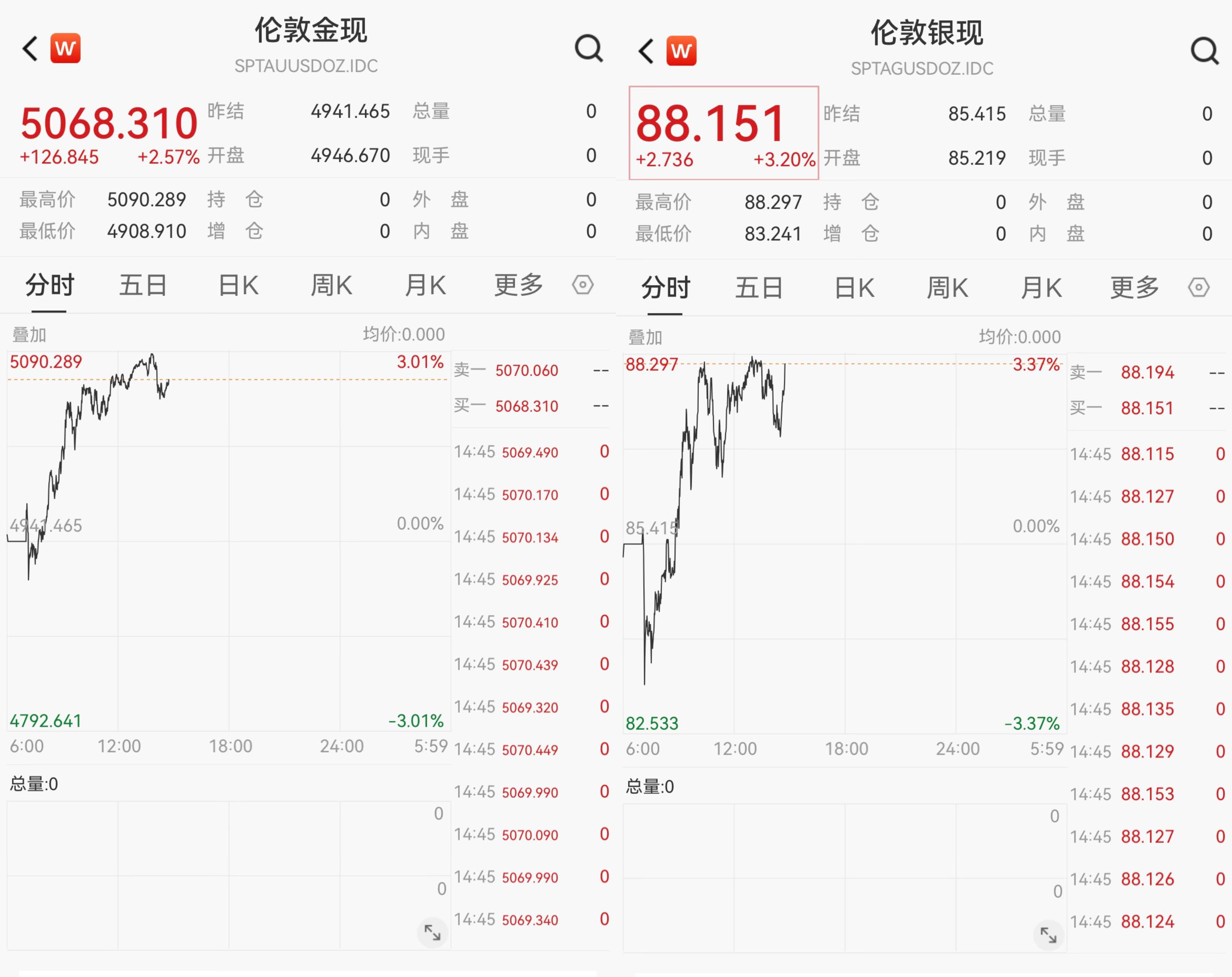 截至发稿,现货黄金涨至5068.31美元/盎司,涨幅2.57%;现货白银涨至88.151美元/盎司,涨幅3.20%。