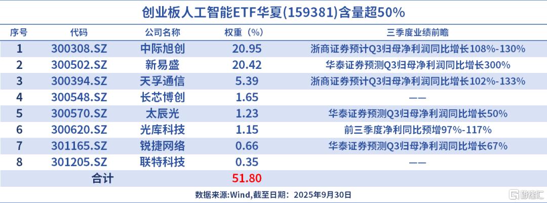 机构预计三季度光通信板块归母净利润同比增长167%,头部光模块厂商业绩有望延续同比高增态势,其中创业板人工智能ETF华夏(159381)前三大权重股中际旭创(20.95%)、新易盛(20.42%)、天孚通信(5.39%)三季度净利润同比预计均超100%。