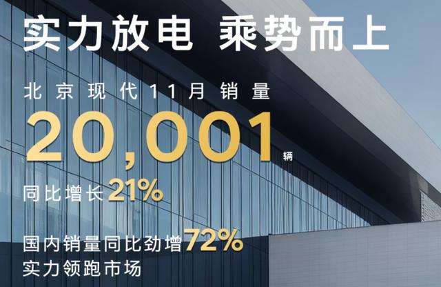 近日,北京现代对外公布最新销售答卷,该公司2025年11月的销量为20001辆,同比增长21%,其中国内市场销量同比增长72%。这也是北京现代继10月售出20016辆汽车后,单月销量连续第二个月突破2万辆大关。