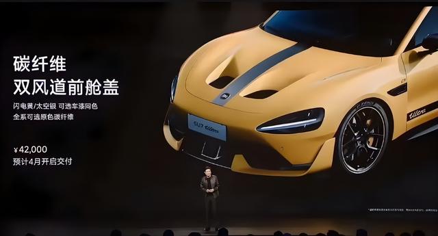 将时间拨回2025年2月,在新车小米 SU7 Ultra的宣传中,雷军重点介绍了选装配件“碳纤维双风道前舱盖”,称这款售价为4.2万元的前舱盖与纽北赛道原型车采用相同的空气动力学设计,拥有两个贯穿风道,能实现前部空气高效导流。