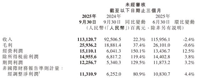 2025年第三季度,小米集团实现净利润122.57亿元,非国际财务报告准则下的经调整净利润为113.11亿元,同比增长80.9%,并创下单季度盈利新高;前三季度的经调整净利润亦实现了73.5%的显著增长,来到328.17亿元。