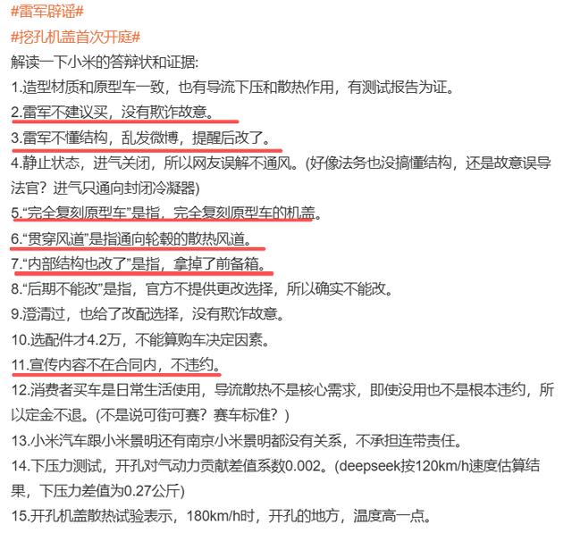 有业内人士称,小米法务团队的辩护逻辑不外乎两点,一是强调雷军多次在宣传中表示产品价格贵,不建议购买,已经尽到了提醒消费者的义务;二是量产机盖只是照着原型车的样子做的,且宣传内容不在购车合同内,不构成违约。