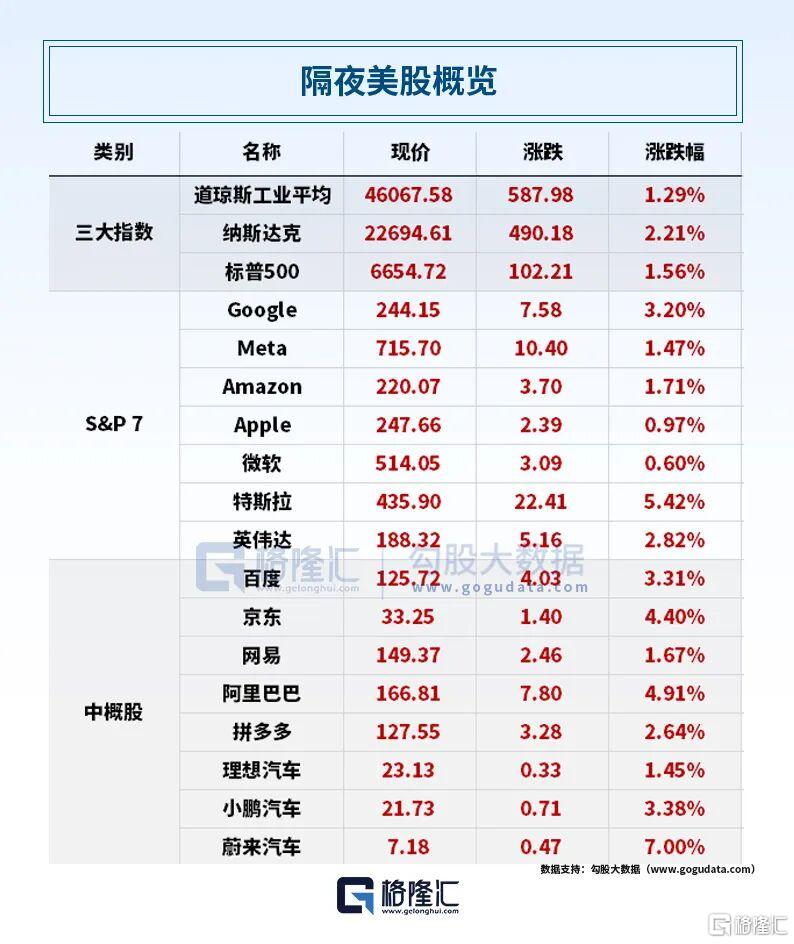 美股方面,三大指数全面上涨。道指涨1.29%,纳指涨2.21%,标普500指数涨1.56%。大型科技股同步上涨,特斯拉涨超5%,谷歌涨超3%,英伟达涨超2%,亚马逊、Meta涨超1%,苹果涨近1%,微软涨0.6%。