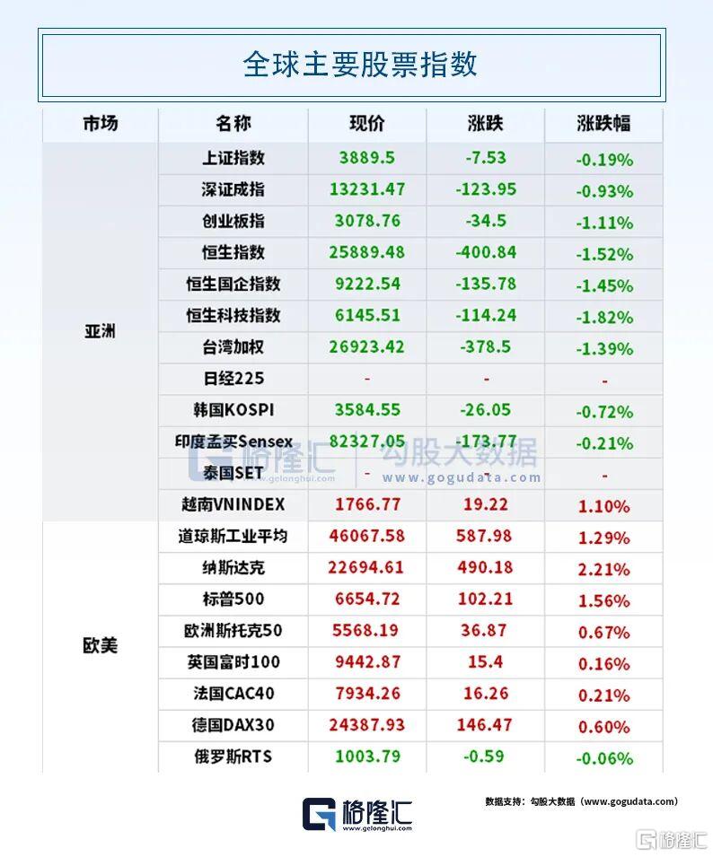 全球资产表现上,现货黄金上涨0.03%,报4111.87美元/盎司。现货白银上跌0.08%报52.53美元/盎司。WTI 11月原油期货收涨0.22%,报59.2美元/桶。布伦特12月原油期货收跌1.05%,报63.39美元/桶。