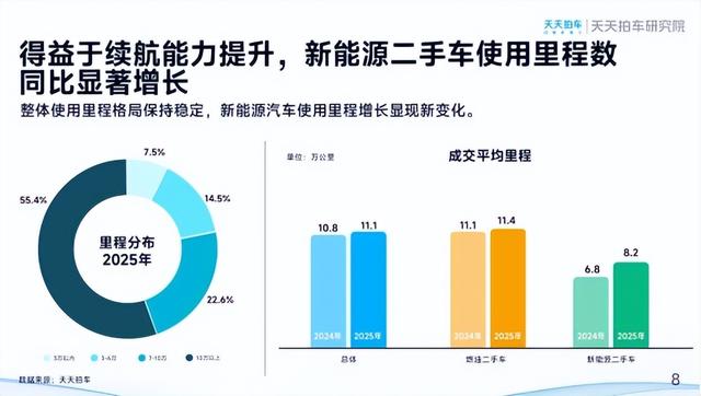 在成交二手车使用里程数据方面,整体使用里程分布格局保持稳定,2025年平台成交二手车平均里程为11.1万公里,同比2024年小幅增长。其中,燃油二手车成交平均里程为11.4万公里,新能源二手车成交平均里程为8.2万公里。得益于新能源汽车在续航能力等综合驾驶体验方面的优化,交易新能源二手车使用里程显著提升。
