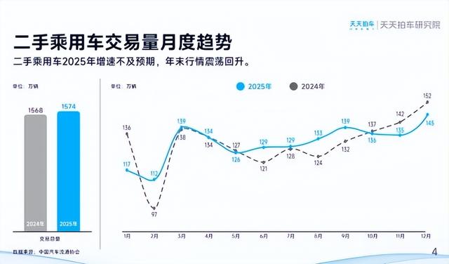 中国汽车流通协会披露的数据显示,2025年全年我国二手车累计交易量为2010.80万辆,同比增长2.52%,与同期相比增加49.38万辆,累计交易金额为12897.90亿元。其中,二手乘用车交易量约1574万辆,同比2024年实现微弱增长,市场规模保持稳定。
