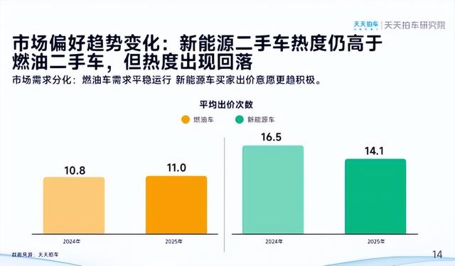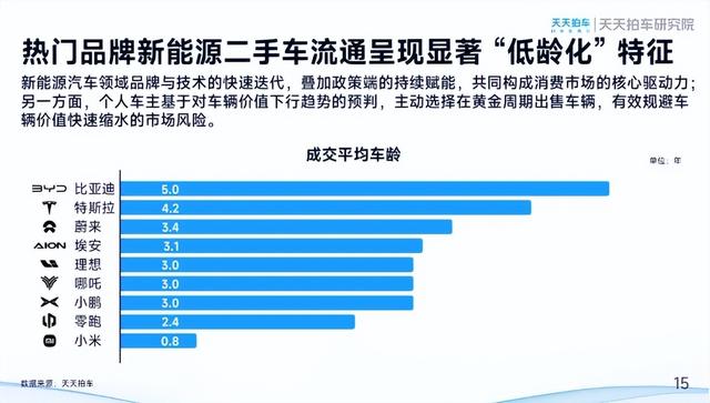 市场活跃度方面,报告显示,2025年新能源二手车平均出价次数为14.1次,虽较2024年的16.5次有所回落,但仍高于燃油二手车的11次,显示买家出价意愿更趋积极。聚焦热门品牌新能源二手车呈现显著“低龄化”特征,理想、哪吒、小鹏品牌成交平均车龄均为3.0年,埃安3.1年,蔚来3.4年,特斯拉4.2年,比亚迪5.0年,远低于燃油二手车8.6年的平均车龄。