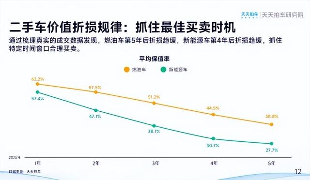 保值率方面,2025年新能源二手车市场进入价值重塑期,保值率触底企稳。《报告》数据显示,2025年新能源车1年保值率为57.4%,2年为47.1%,3年为38.1%,4年为30.7%,呈现“前4年快速折损,4年后趋缓”的特征;燃油车1年保值率62.2%,2年57.5%,3年51.2%,4年44.5%,5年38.8%,折损速度在第5年相对放缓。