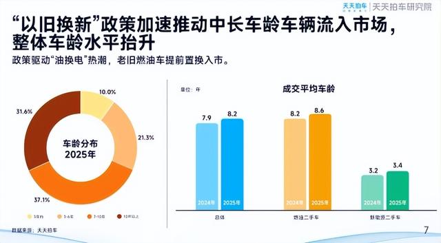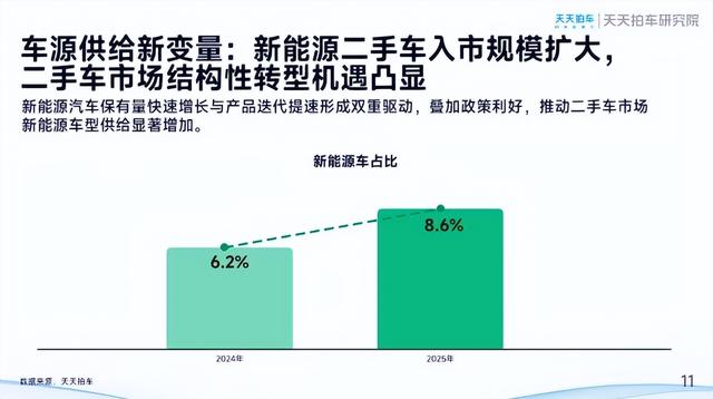 天天拍车平台数据显示,2025年新能源二手车成交量占比从2024年的6.2%提升至8.6%,增长显著。供给端方面,新能源汽车保有量增长与产品迭代提速形成双重驱动力,叠加"以旧换新"、"油换电"政策引导,带动新能源二手车交易规模持续扩大。